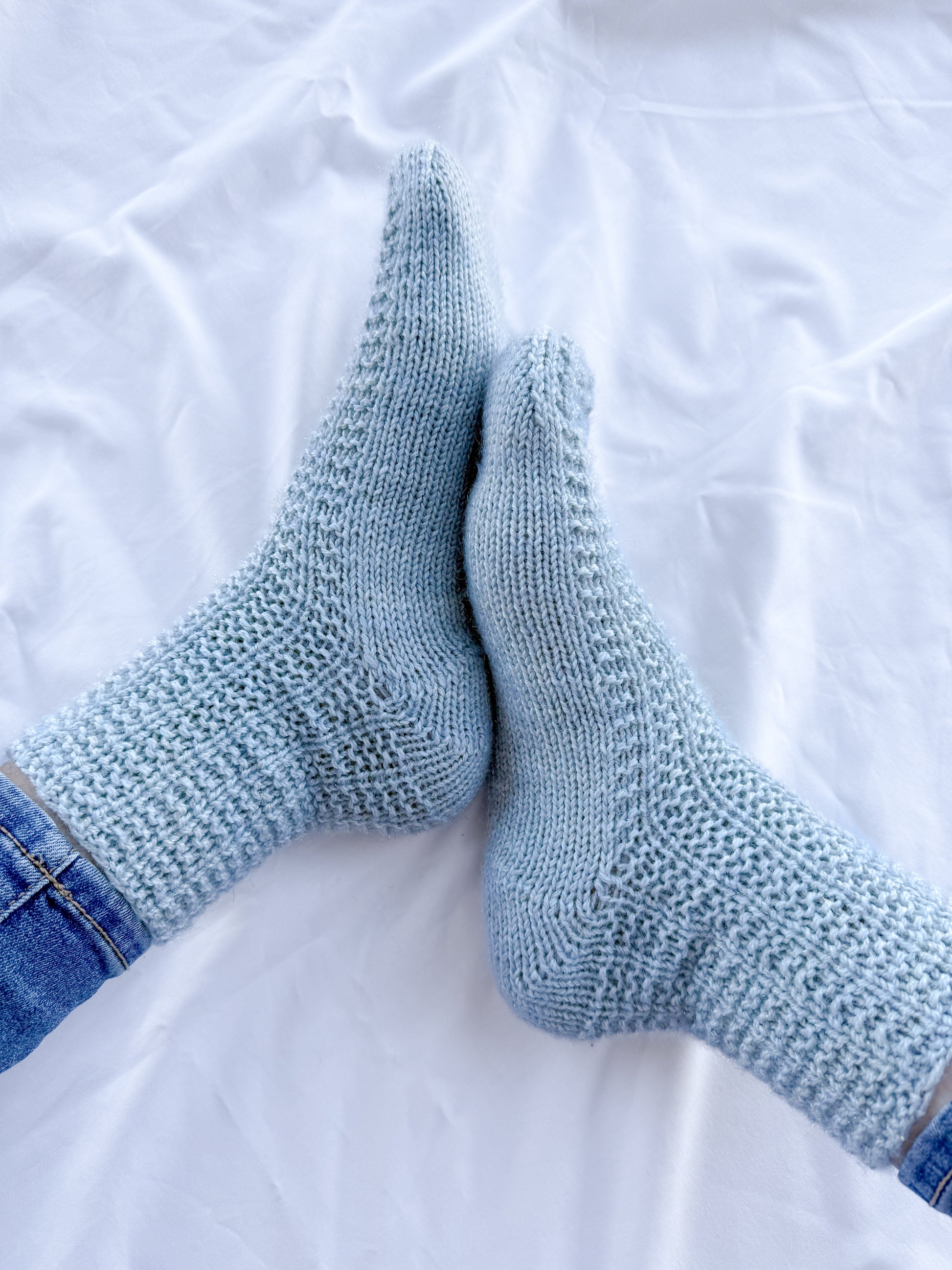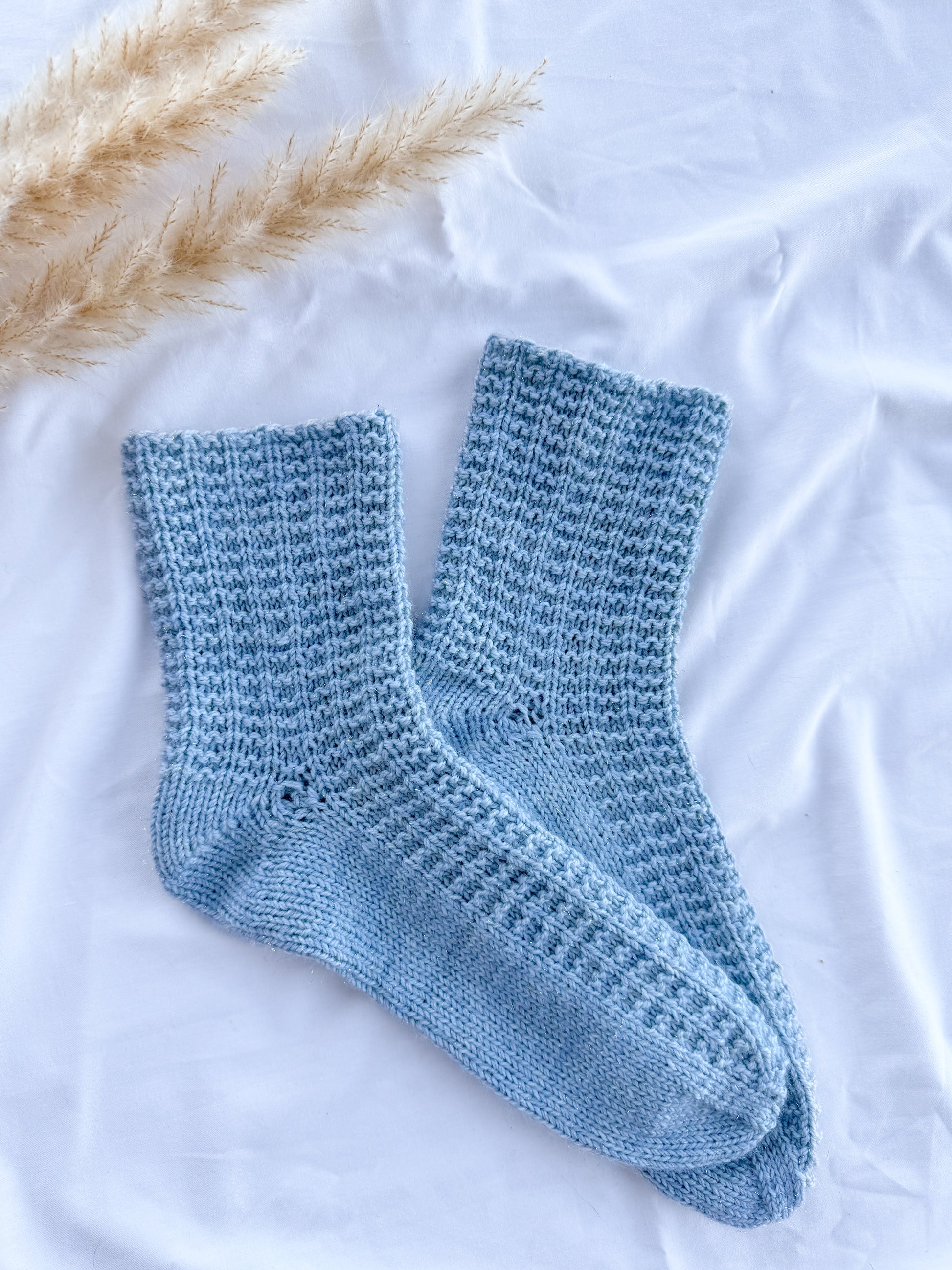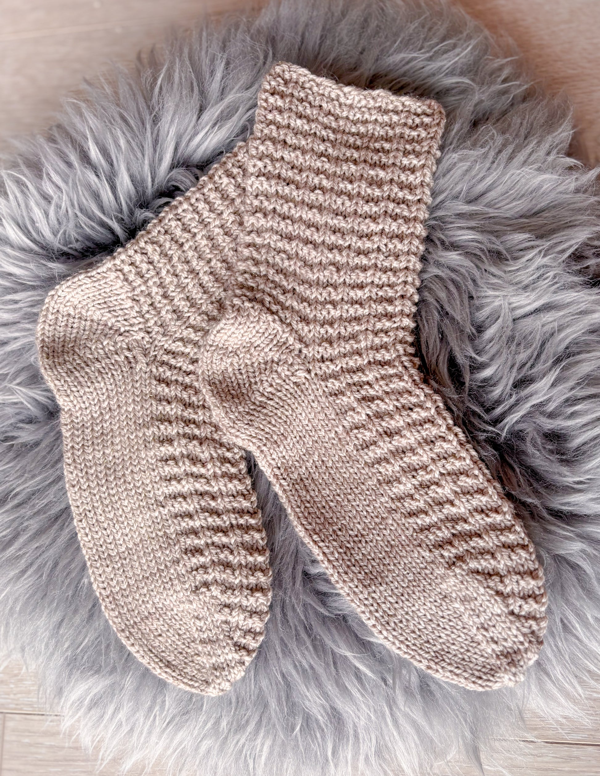 Easokker Mysize er kjappstrikka sokker i enkel struktur som består av kun rett- og vrangmasker. Du starter med å strikke skaftet, før hælen formes med vendepinner (German Shortrows). Det strikkes så etter struktur oppå foten og glattstrikk under, før det felles til tå. Mamma- & minimatch? Sjekk ut Easokker til barn <3