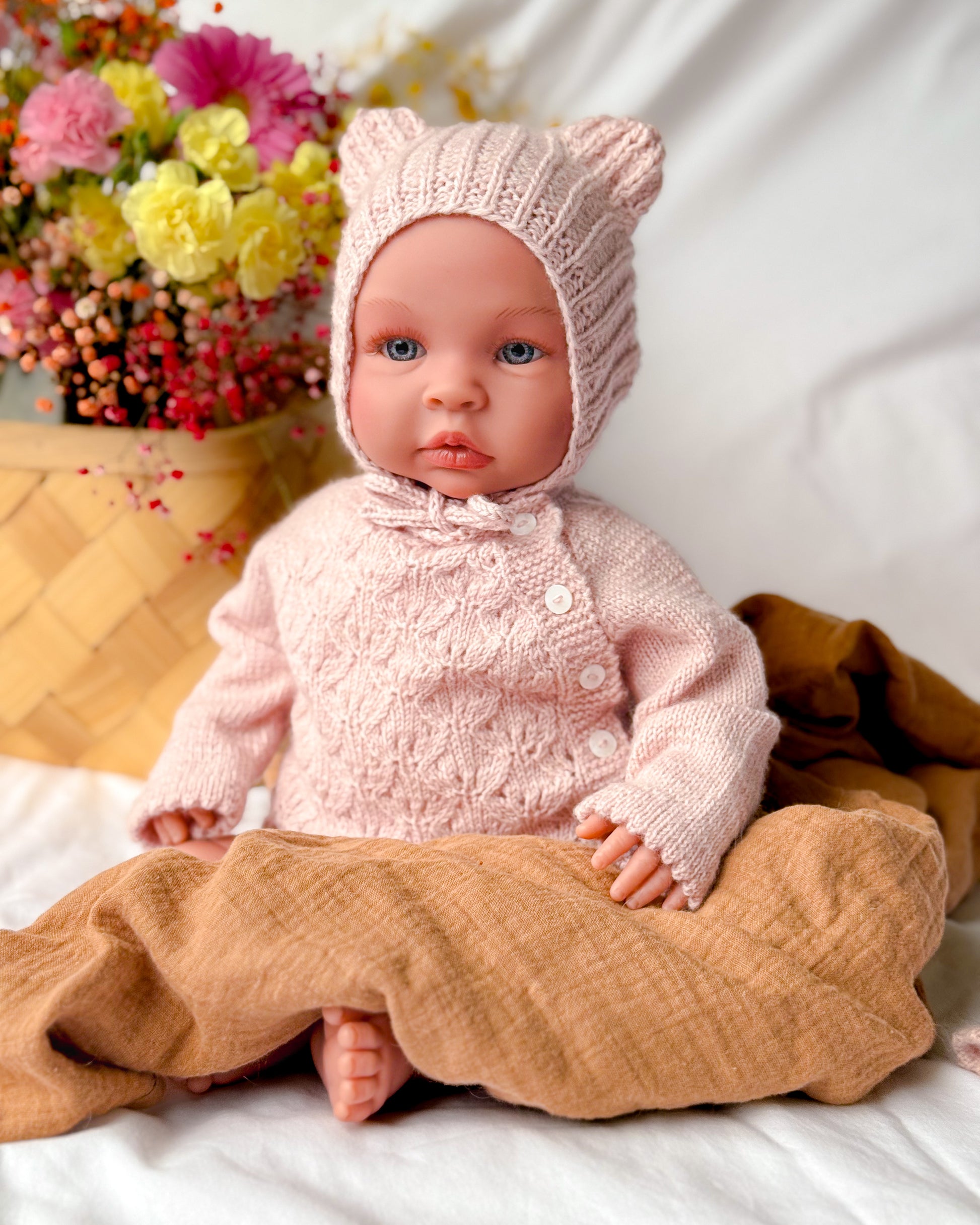 Inez Hentesett er et yndig hentesett med delikat struktur. Jakken strikkes nedenfra og opp med picotkant på bol og ermer. Det strikkes struktur over forstykket, og felles til raglan på bærestykket samtidig som man strikker struktur. Ermene strikkes i glattstrikk. Ønsker du å kjøpe hele settet til rabattert pris? Klikk her: Inez Hentesett med kyse og strømper – Trudeknits