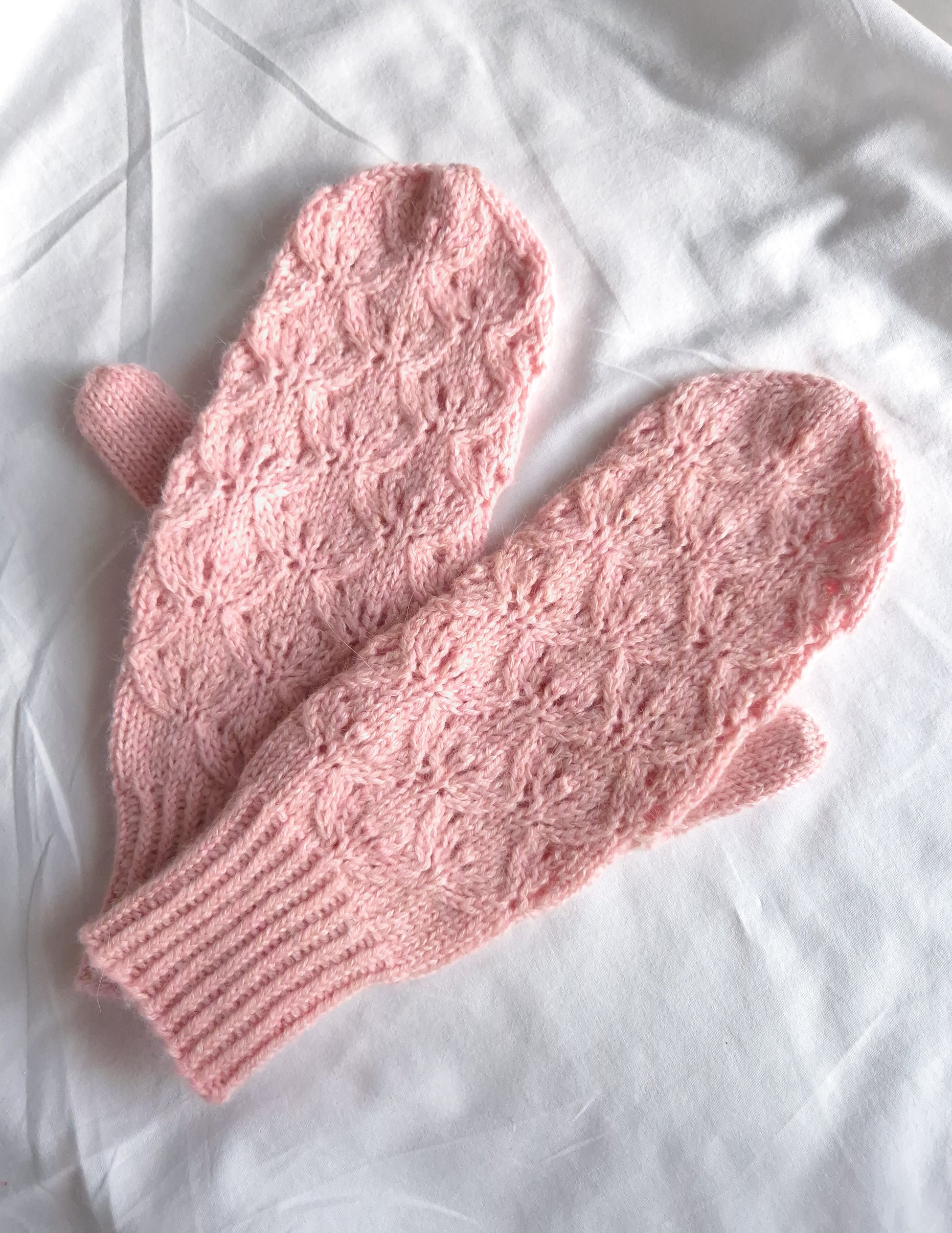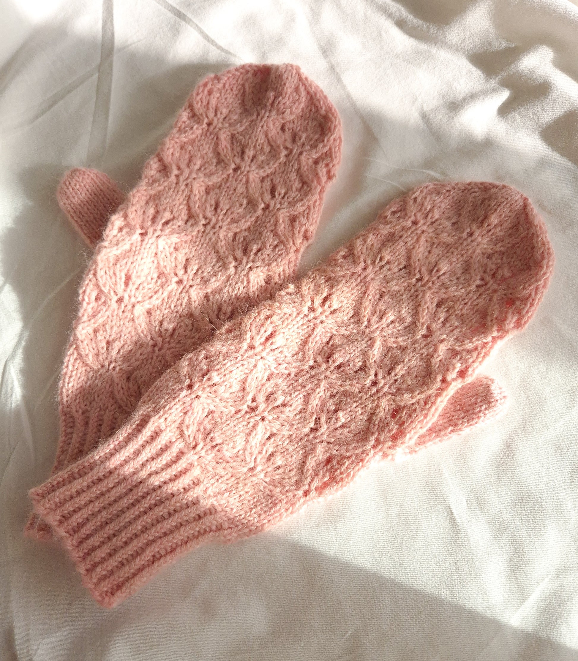 Vottene er One size, og bredden er ca. 10 cm, men på grunn av strukturen er den stretchy og passer både smalere og bredere hender. Lengden justerer du selv ut ifra lengde på hånden. Om du strikker vottene i gave og er usikker på lengde, så er ca. 18-20 cm normal lengde til damehånd. Fellingene måler 3 cm, mål votten underveis for å vite når du skal felle.