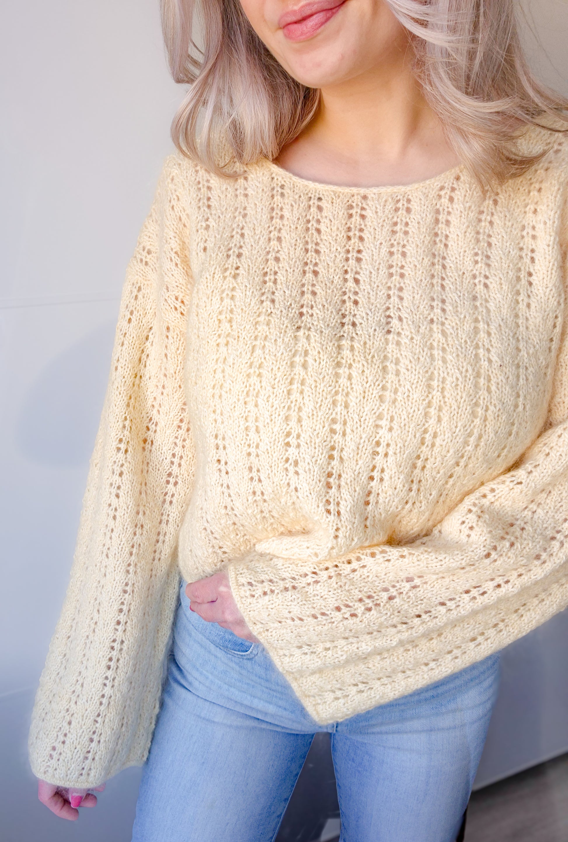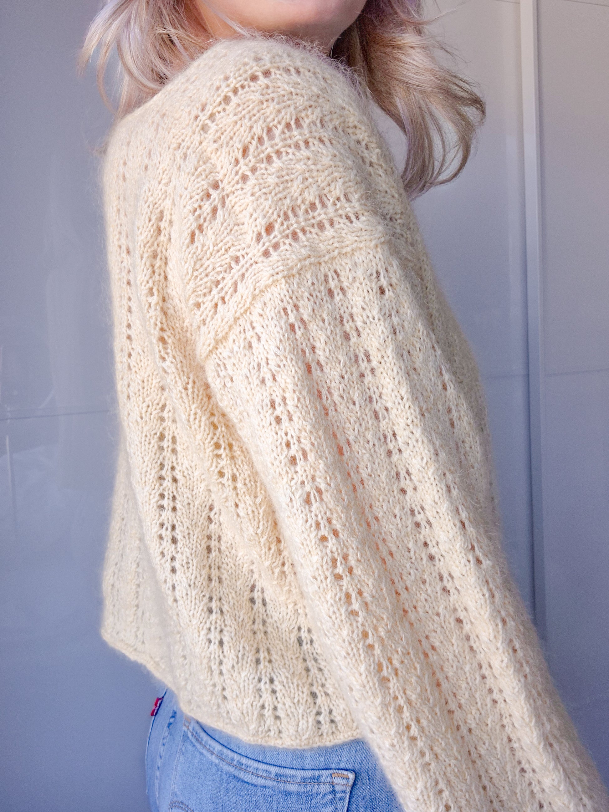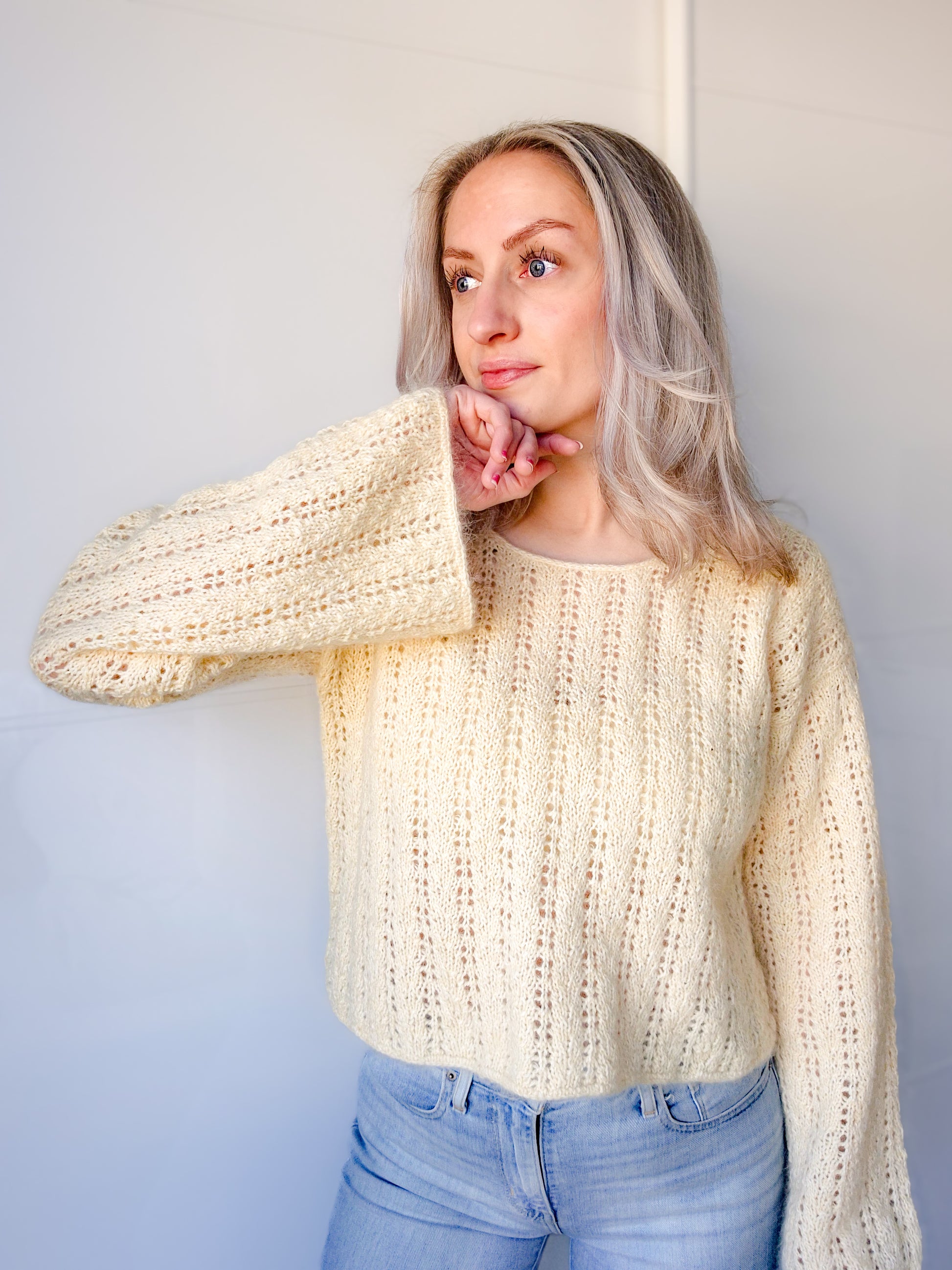 Mathildablouse er en delikat bluse med enkel hullstruktur, cropped passform og lange ermer. Blusen strikkes ovenfra og ned med bakstykket først. Det plukkes opp m til skuldre som samles til forstykket og deretter bol. Halskanten plukkes opp og felles i i-cord. Det plukkes opp masker til ermene som strikkes rundt i struktur.